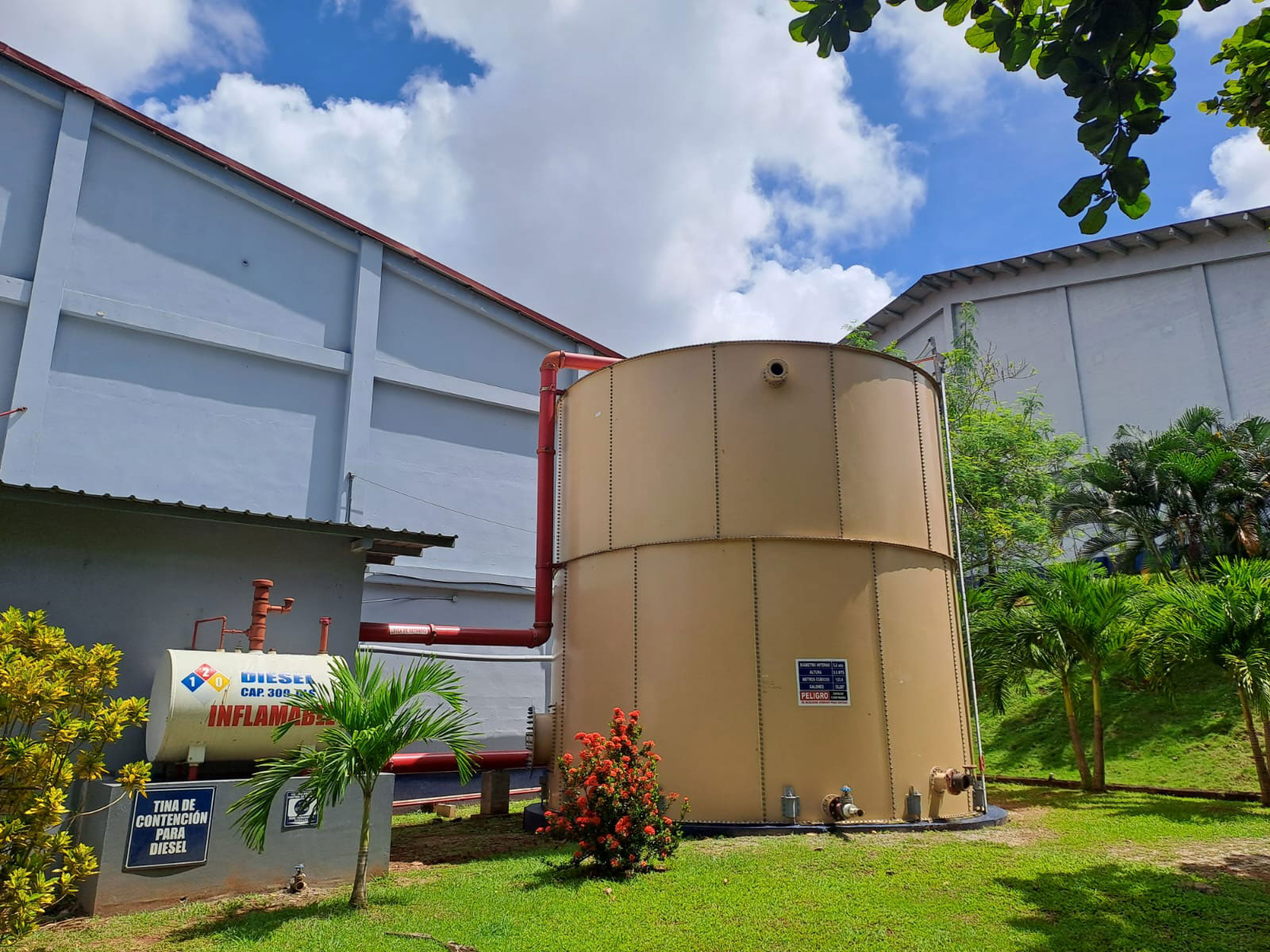 Esto a base de gabinetes de mangueras clase I y III así como hidrantes y monitores de agua – espuma. Además se suministró e instaló un carro movible de espuma, equipo de bombeo contra incendios y tanque de acero apernado para el almacenamiento de agua.